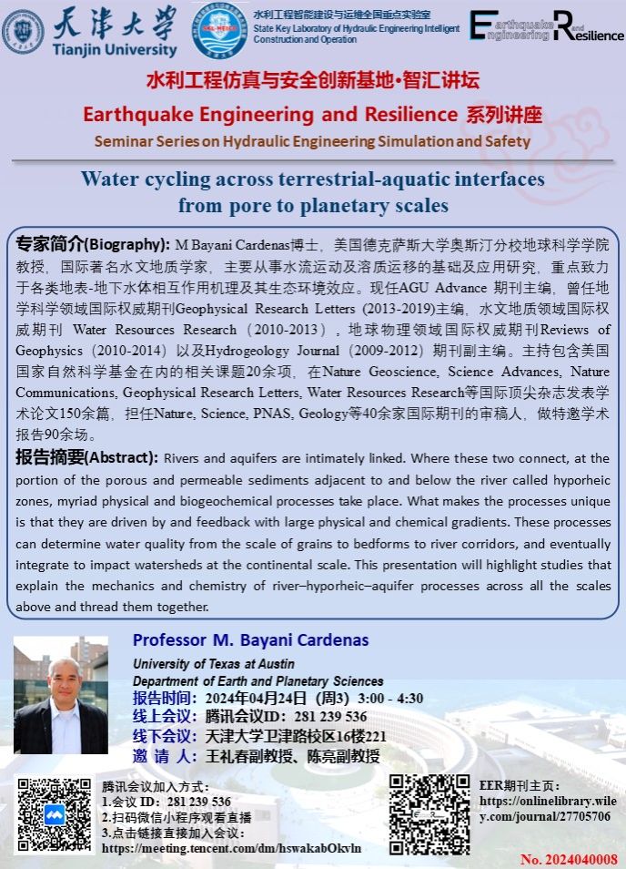 2024年4月24日(周三)下午15:00-16:30,美国德克萨斯大学奥斯汀分校M. Bayani Cardenas教授兼AGU Advances主编将带来《Water cycling across terrestrial-aquatic interfaces from pore to planetary scales》的前沿学术讲座,诚邀各位老师和同学参加。