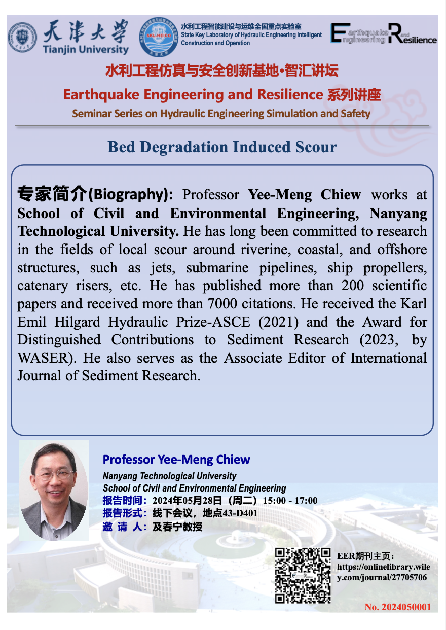 2024年5月28日(周二)下午15:00-17:00,新加坡南洋理工大学Yee-Meng Chiew教授兼International Journal of Sediment Research副主编将在天津大学北洋园校区43楼D401带来《Bed Degradation Induced Scour》的前沿学术讲座,诚邀各位老师和同学参加。