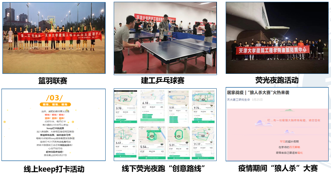 体育是一个发展身体,增强体质,培养道德、意志品质的教育过程。一直以来,建工学院高度重视研究生身心健康塑造、体育习惯化及校园体育文化的培养。在开展师生“体育文化月”基础上,创新活动形式,于线上线下开展“keep”打卡、狼人杀大赛等特色活动,促进师生情谊和课题组凝聚力,激发研究生体育锻炼内生动力,为打造体育强国做出天大贡献。