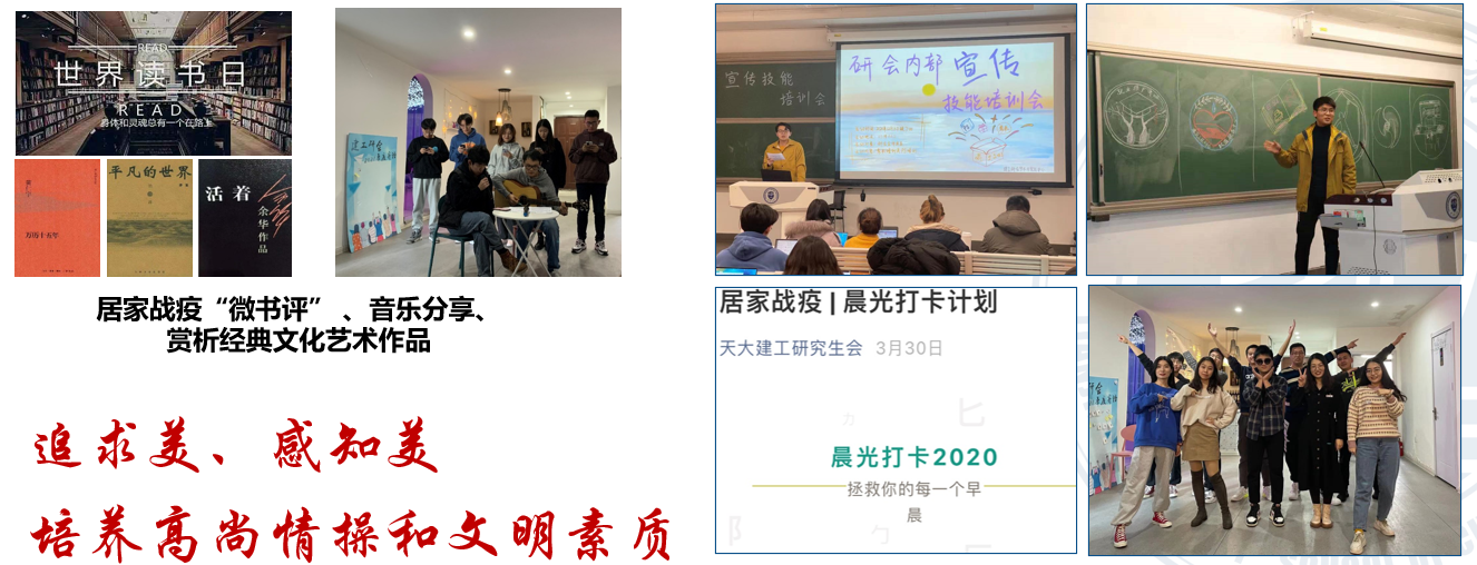 坚持美育教育,以美育人,以美化人,充分利用研会破冰晚会、宣传技能培训等活动,大力推动美育普及,培养研究生鉴赏美、创造美的能力。结合疫情实际,开展“居家战疫”、 音乐、文化艺术分享等,激发研究生追求美、感知美,培养研究生高尚情操和文明素质。