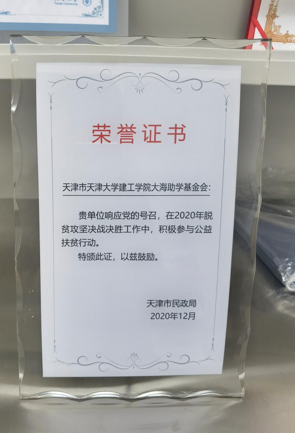 天津市天津大学建工学院大海助学基金会因为2020年扶贫工作表现优秀,被授予了锦旗