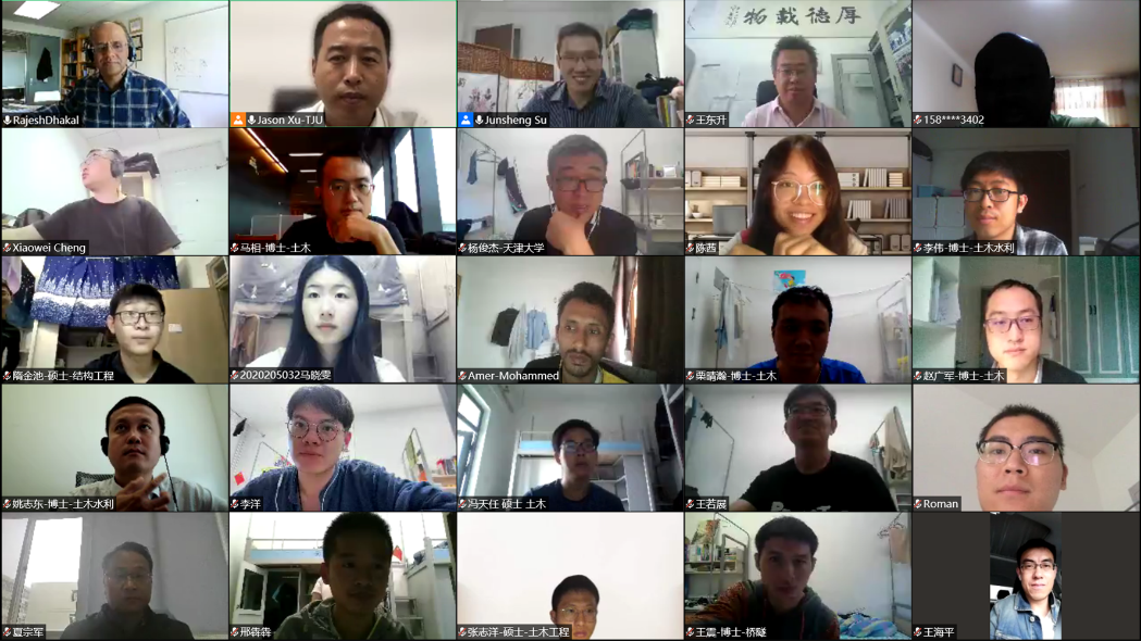 本次会议由天津大学建筑工程学院徐杰副教授主持,报告邀请人天津大学建筑工程学院苏俊省老师开场欢迎并介绍了Rajesh Dhakal教授。讲座期间,Rajesh Dhakal教授通过“云端”重点介绍了坎特伯雷大学进行的实验和分析研究,并分享了自己团队对混凝土抗震评估和钢筋混凝土建筑框架设计的最新研究成果。通过这次精彩的报告,与会师生对特伯雷大学开发的塑性铰单元有了更为深入的了解,它可以可靠地预测钢筋混凝土梁/框架的延伸率,并可用于延性框架建筑的抗震性能评估。随后,Rajesh Dhakal教授在线解答了老师、同学们提出的相关问题,并开展了热烈的讨论。讲座结束后,与会人员进行合影留念。