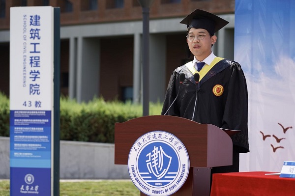土木工程专业2016级本科生杨晓通作为毕业生代表,与大家分享了他大学四年的收获与感悟。连续三年获得国家奖学金,事迹登上天大官微、人民日报,获天津市大学生自强自立年度人物、天津大学第二十六届十佳杰出青年的他,在奋斗拼搏中感悟天大之大,在激昂青春里领略天大之美。他与同学们共勉道:“过了今天,我们即将多了一个新的身份,那就是天大校友、建工院友。这不仅是一份激励,更是一份责任,激励着我们时刻铭记‘移山填海,建功立业’的精神,勇于接过前人的接力棒,抢险滩,立潮头,在奋斗中立天大志向,在拼搏中展天大襟怀,在奉献中承天大责任,用青春续写新时代的建工故事。”