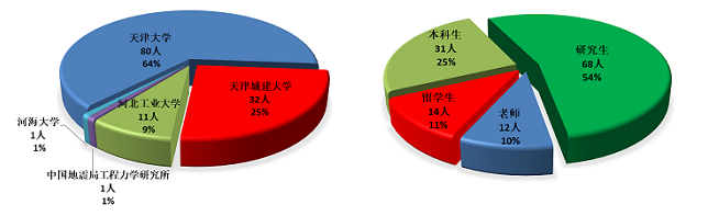 讲座由天津大学建工学院徐杰副教授主持,学院副院长蒋明镜教授出席讲座并致欢迎词。讲座期间,Luis A. Dalguer教授通过“云端”在瑞士围绕断面破裂地震引起的断层位移对周围重要基础设施的潜在危害这一问题展开详细介绍,并就如何通过仿真手段获取断层位移和近源地震动的主要特征分享了自己的研究成果。通过报告,与会师生对断面破裂地震引起的断层位移模型和基于动态粗糙破裂模型的断层位移评估方法等有了深入了解。报告后,与会师生就相关问题开展了热烈的线上讨论,并进行了线上合影留念(图1)。据统计,本次“云讲座”共有来自天津大学、天津城建大学、河北工业大学、河海大学、中国地震局工程力学研究所的125名师生参与,其中教师12人、研究生68人、国际留学生14人、本科生31人(图2),师生对此次讲座反响热烈,并对下次“云讲座”充满期待。