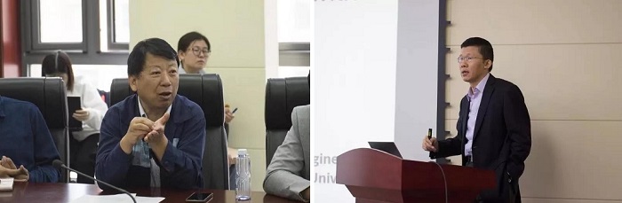 左图为朱涵教授主持会议,右图为钱吮智博士在报告中。