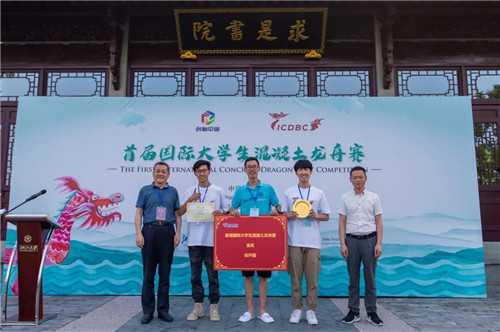 经过激烈角逐,由天津大学建筑工程学院本科生陈浩宇、苏志伟、邹熠组成的代表队拔得头筹,荣获首届国际大学生混凝土龙舟赛金奖(第一名)!