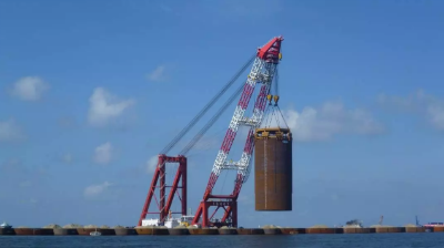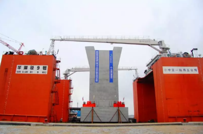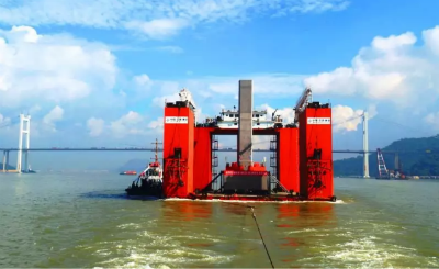 港珠澳大桥桥墩预制件加固在半潜驳运输船上