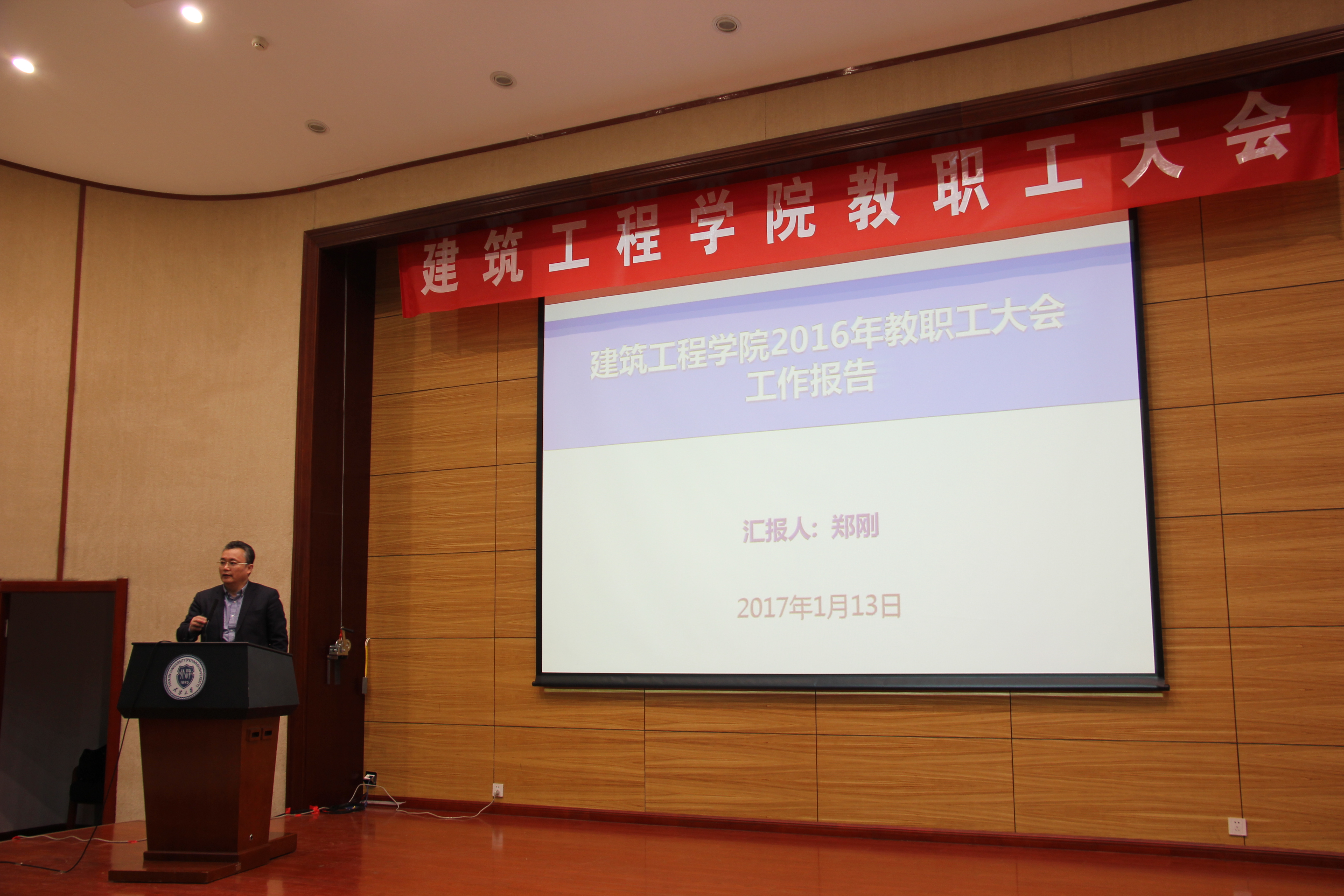 本站讯 2017年1月13日,建工学院在科图二层报告厅召开教职工大会,院党委书记练继建、院长郑刚、副院长高喜峰出席会议,院教代会代表、工会委员等150余名教职工参加,会议由院党委副书记、教代会主任、工会主席李京霖主持。 会上,郑刚院长作了2016年度学院工作报告。他指出,在“十三五”规划的开局之年,建工学院在学科评估、队伍建设、科研项目、科研经费、论文专利、教学竞赛、国际合作等方面都有显著成果和稳步增长,这离不开每一位教职工的付出和努力;同时郑院长也和老师们共同探讨了在助力学校“双一流”建设过程中,学院面临一定的挑战:高层次青年人才的匮乏,传统学科的一流建设如何开展,现行院、系、所科研运行体制的挑战等等;最后郑院长指出“自强首在储才,储才必先兴学”,他勉励全体教职工要担当兴学强国的使命与责任,迎接挑战,“撸起袖子加油干”。