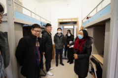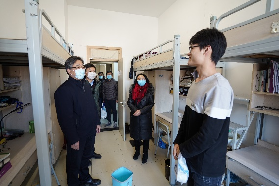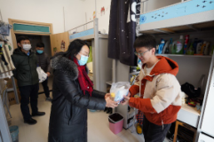 随后,韩庆华一行来到学生宿舍,向宿管工作人员详细了解假期宿舍管理情况,并与留校的学生们亲切交流,为同学们送去了口罩、消毒液等防疫物资,表达学院的慰问和关怀。本科生路恒、郭家越两名同学因为石家庄疫情暂时不能回家,韩庆华亲切询问了目前生活学习情况和实际需求,叮嘱同学们留校期间注意安全,合理规划好学习生活,并与家长、辅导员保持联系。研究生陈宏运、赵宇鹏等同学为完成科研任务暂时留校,王葳详细询问了科研进展和离校计划,勉励同学们踏实科研、认真生活,让假期过得有意义。