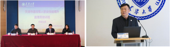 天津市退役军人事务局就业创业处一级主任科员毛志勇,天津市金泰基业工程管理(集团)有限公司董事长裴景辉,天津大学建筑工程学院副院长王希然,天津大学建筑工程学院高端教育培训中心主任白杰、副主任郭伟萍出席了开班仪式。仪式由白杰主任主持。