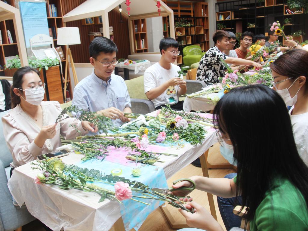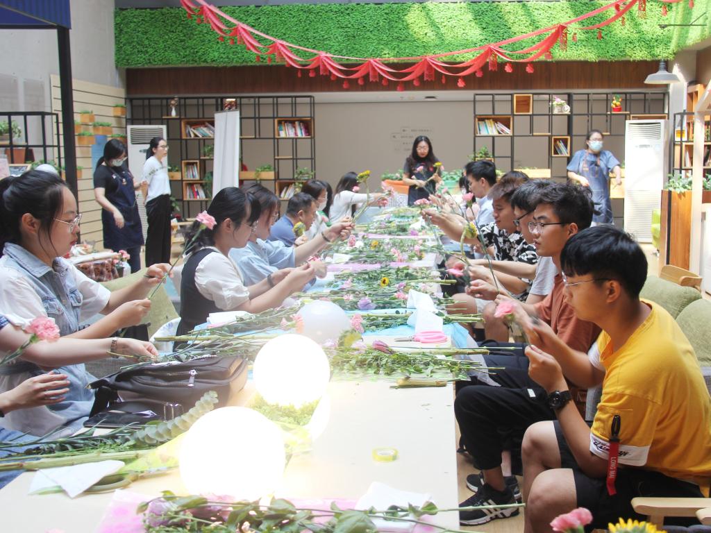 随后,在专业花艺师的指导下,师生们纷纷自己动手,创意制作,用基础的螺旋手法,通过修剪花材、高低错落打花束、保湿处理、S型折纸、L型折纸、包装花束等制作流程,将一枝枝简单的花材变成一束束饱含谢意与祝福的花束,共同分享着节日的喜悦。