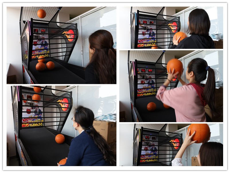 篮球投篮比赛现场,老师们在多个关卡的计时挑战中,不断地瞄准、抛出,一道道抛物线划过,一个个球应声入网,汗水与笑声交织不断。