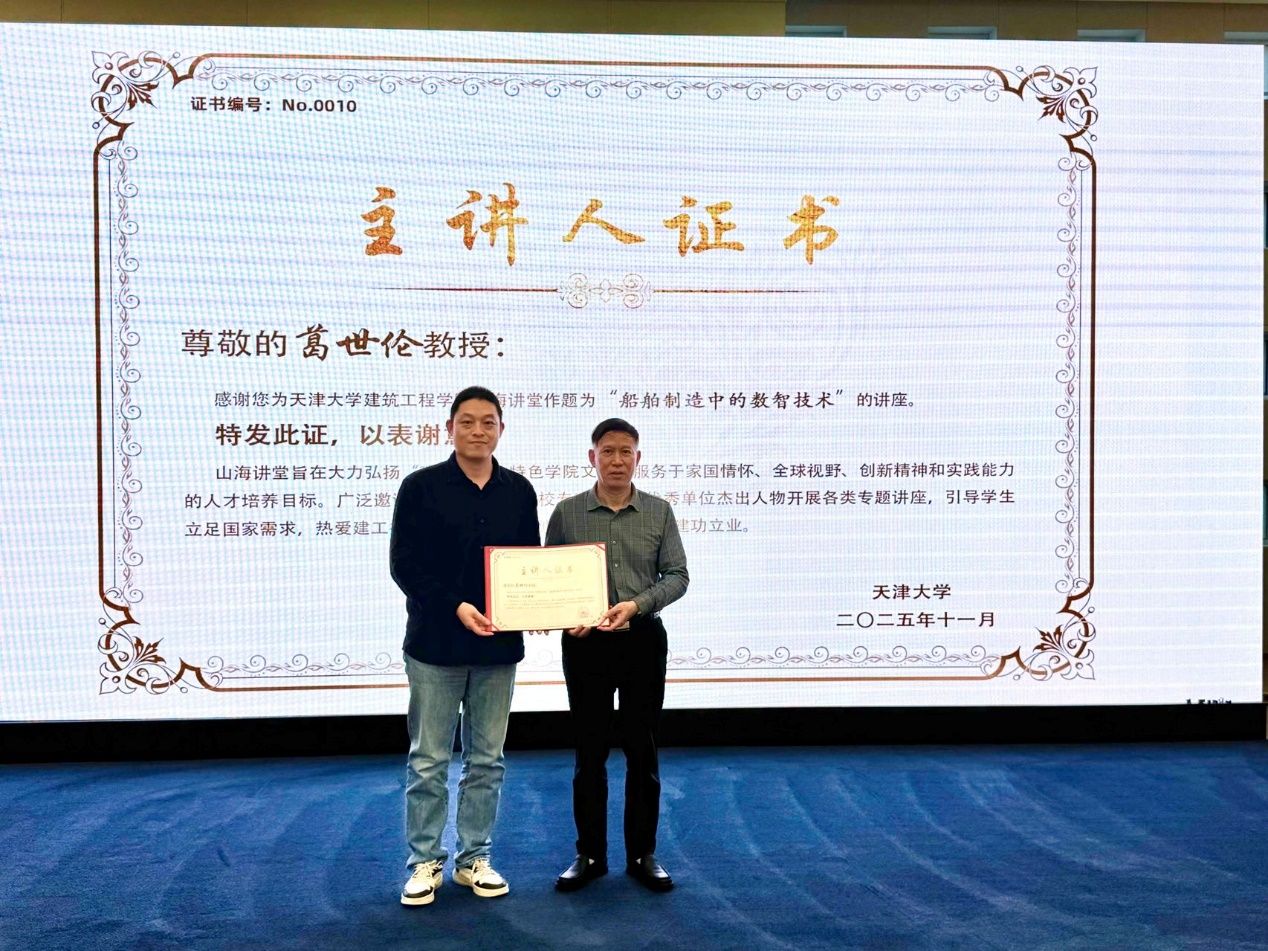 11月1日,由建筑工程学院主办,院青年教师联谊会与院研究生会联合承办的2025年度第8期(总第10期)“山海讲堂·专家讲座”活动在北洋园校区56楼张含英厅举办。江苏科技大学原党委书记葛世伦作了题为《船舶制造中的数智技术》专题报告,天津大学建筑工程学院副院长杜尊峰、海洋工程与智能海事系副主任李英、高新舰船及海洋装备智能设计与船海工程管理系教师李焱及校内外一百三十余位师生出席活动,活动由杜尊峰主持。