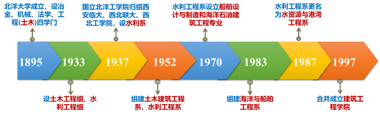 天津大学建筑工程学院于1997年由原土木工程系、水资源与港湾工程系和船舶与海洋工程系合并成立,办学历史可上溯至1895年天津北洋西学学堂设立的工程学门。