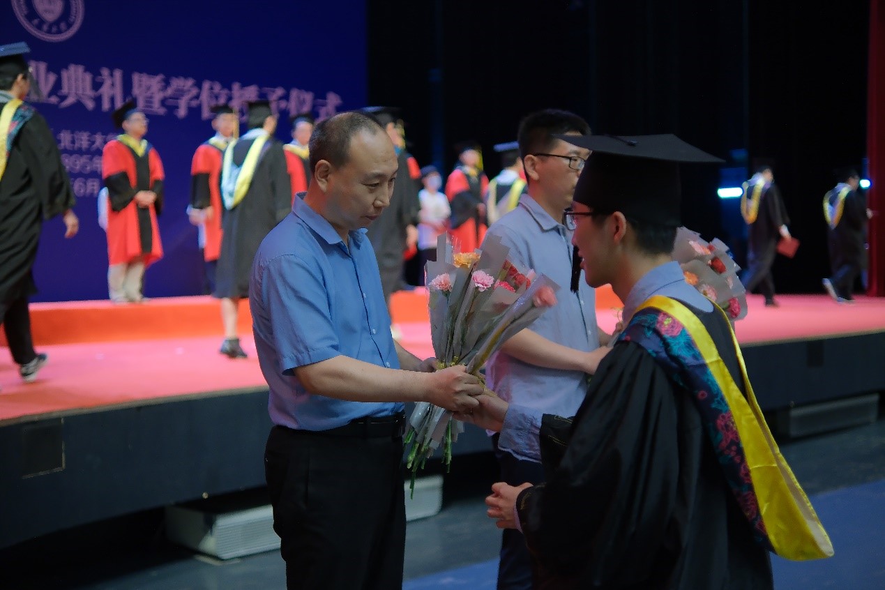 全体毕业生依次走过谢师台,将手中的鲜花献给为同学们传道受业解惑的老师们。学院领导及各系教师代表为毕业生授予学位,挑苏留影,为同学们的求学生涯画上圆满的句号。