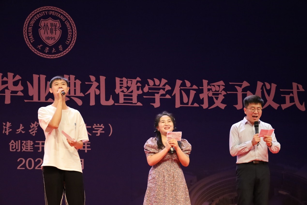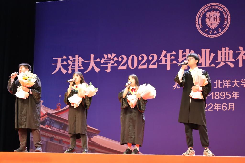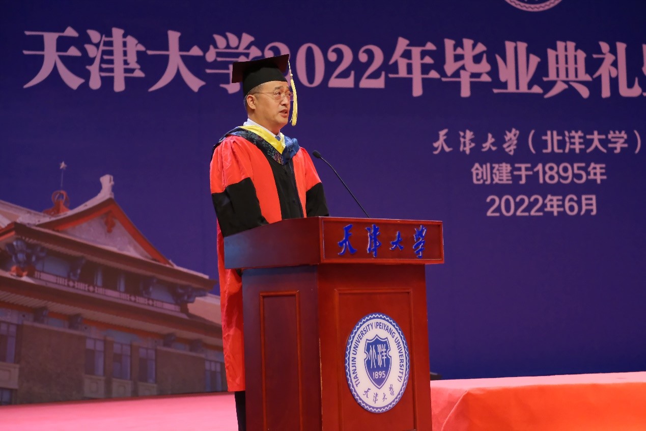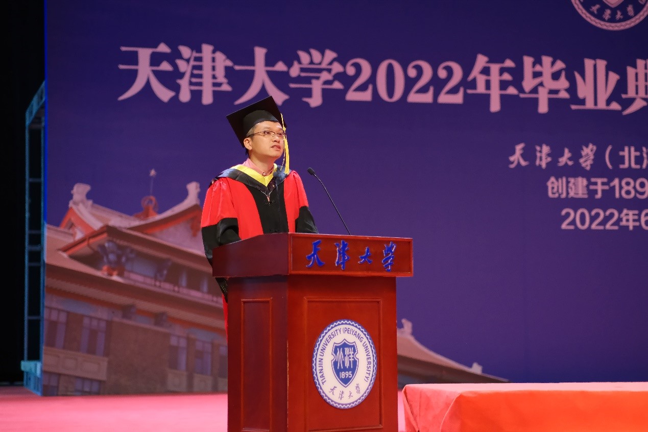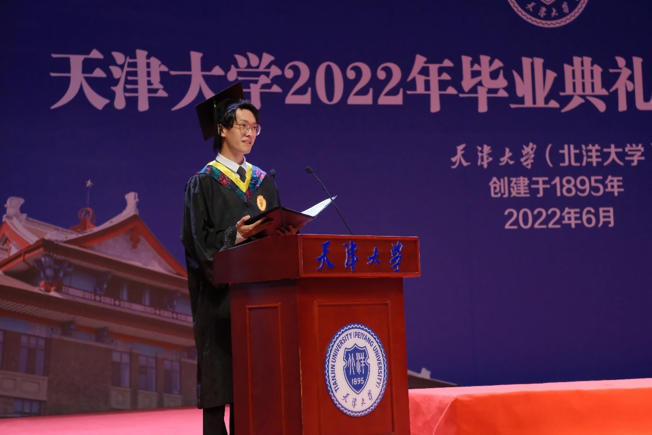 2018级土木工程专业本科生张静泽作为毕业生代表发言,他回顾了在北洋园四年生活的点点滴滴,感谢所有老师和同学们的关怀、帮助。他说,新时代的建工人,要始终独立自信,在奋斗中立天大志向;要学会不断超越自我,在拼搏中展天大襟怀;要时刻坚守家国情怀,在奉献中承天大责任。毕业后的他,即将入职中建四局,前往大湾区为国家的基础建设事业添砖加瓦。他号召同学们将“移山填海,建功立业”的院训时刻牢记在心,奔赴祖国最需要的地方,用青春续写新时代的建工故事。