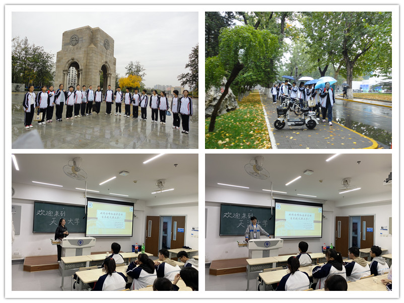 11月5日的游学活动,来访师生在招生宣传协会讲解队的带领下,从东门出发,依次游览了北洋广场、精密仪器与光电子工程学院、药物科学与技术学院、医学院、牛顿苹果树、第九教学楼、敬业湖,在雨中感受天津大学更具朦胧的美感。大家从天大风物到历史溯源,从建筑风格到校园生活,多角度全方位地了解了百年名校的历史积淀和蓬勃发展。为了使高中学生更全面的了解大学校园生活和天津大学招生政策等方面内容,本次游学还特意举行了“学生互动座谈会”。会上,内蒙古招生实践团和招生宣传协会的学长、学姐们分别就大类专业、培养模式、校园生活、招生政策等方面进行了详细的介绍,并就内蒙古新高考“3+1+2”选科政策与同学们进行了交流。期间,大家积极互动,踊跃提问,气氛十分活跃。