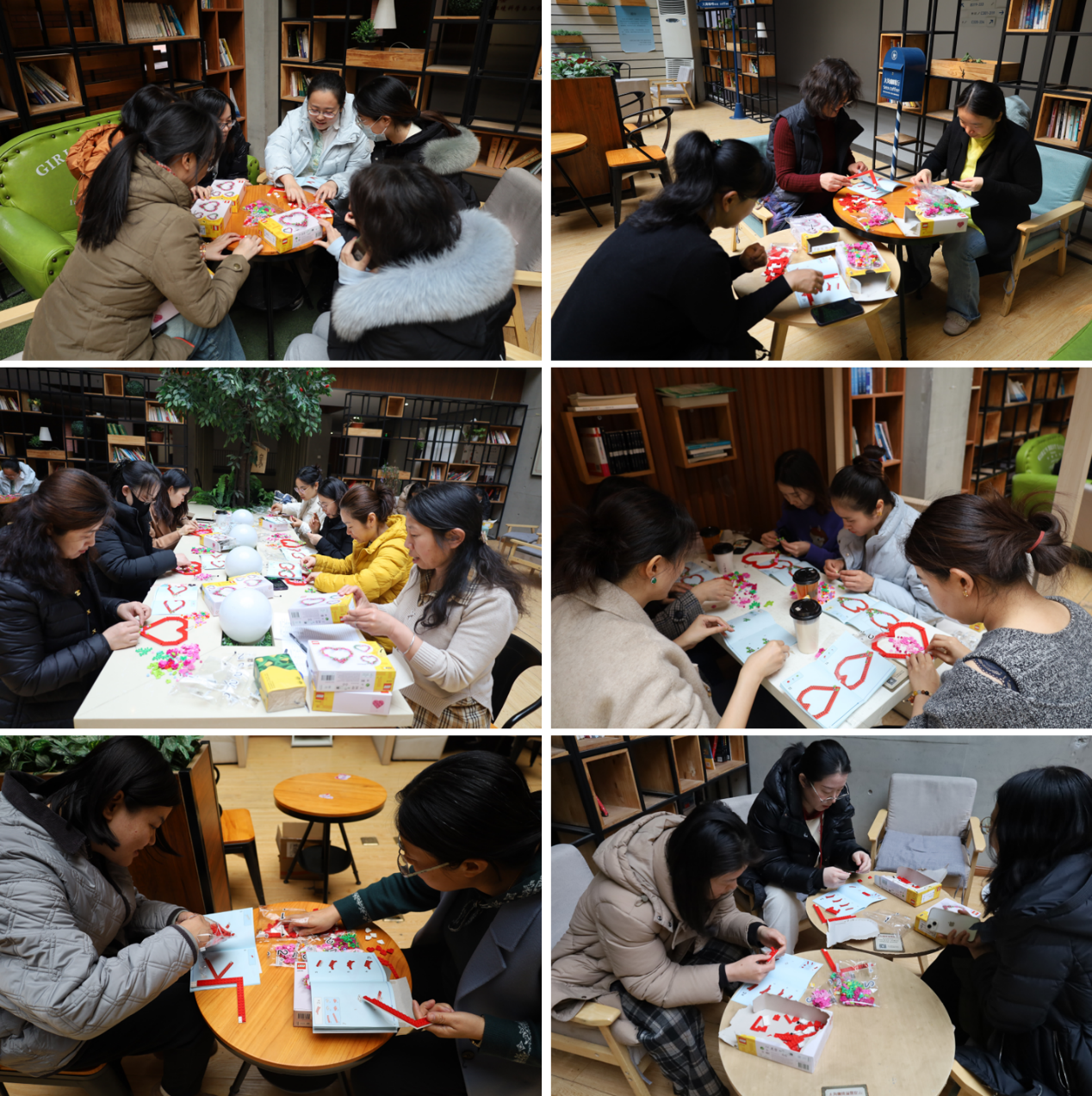 虽然很多老师是首次尝试拼装积木花环,但那些琐碎的零件在老师们灵巧的手中并未成为障碍。大家纷纷拿起指南,或专注独立,或默契协作,将积木颗粒有条不紊地分类摆放。心形轮廓、枝叶、花瓣、花蕊,每一个零件都按照顺序拼接,一朵朵盛开的繁花逐渐汇聚成心形花环。乍看之下,每个花环似乎相似,但细细端详,便能发现其中的微妙差异。不同的配色和微调的位置,都彰显出每位老师独特的创意与匠心。