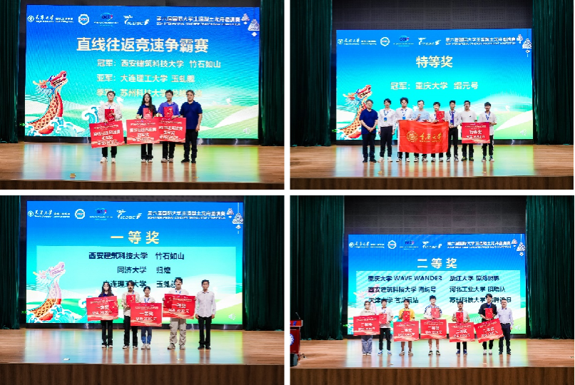 经过技术论文评审、海报展示、材料强度测试、船体承载力测试、曲线障碍行驶赛和直线往返竞速赛等多项目综合比拼,评选出本届赛事特等奖1项、一等奖3项、二等奖6项、三等奖10项、优胜奖29项,最佳论文奖5项、最佳海报奖5项、最佳创意奖5项和直线往返竞速赛的冠、亚、季军。
