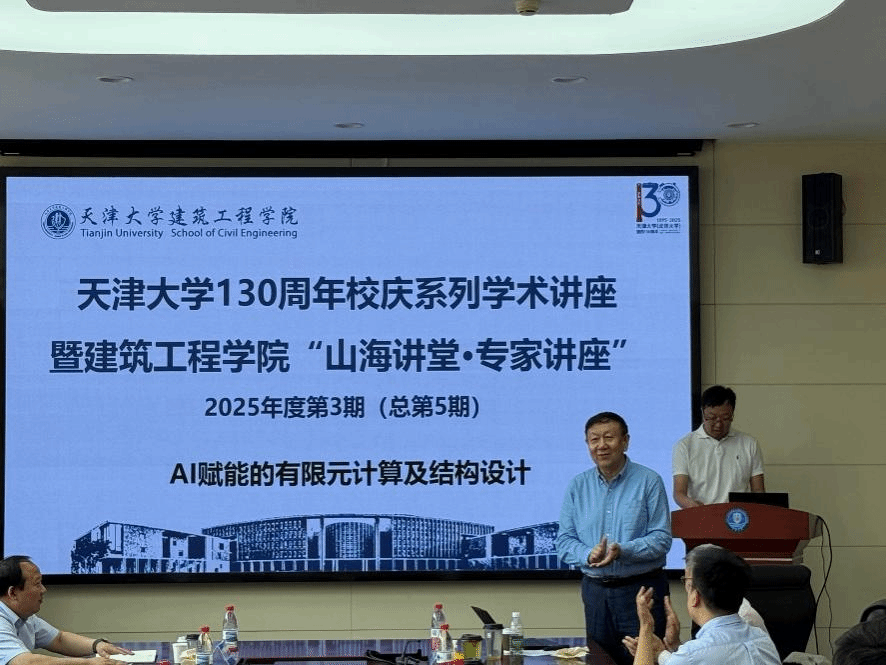 近日,由建筑工程学院主办,院青年教师联谊会与院研究生会联合承办的2025年度第3期(总第5期)“山海讲堂·专家讲座”活动在北洋园校区43教D401会议室举办。应天津大学建筑工程学院唐友刚教授邀请,清华大学原党委委员、清华大学航天航空学院原党委书记、欧洲科学与艺术学院院士庄茁教授作了《AI赋能的有限元计算及结构设计》报告,建筑工程学院院长师燕超教授、建筑工程学院岩土工程研究所赵高峰教授、建筑工程学院船舶与海洋装备智能设计及工程管理系唐友刚教授出席活动,校内外七十余位师生参加活动。