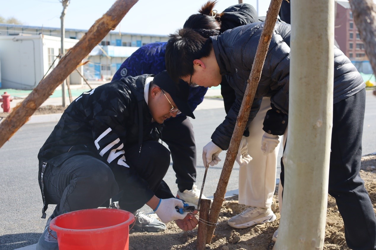 在工作人员的指导下,同学们一起完成挖坑、培土、压实、支护、浇水等步骤。在种植过程中,互相配合、相互鼓励、充满热情。