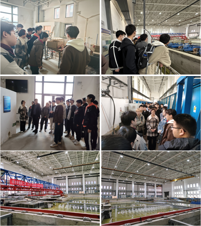 在港口与海岸工程试验大厅,同学们了解了港口与海岸实验室的基本概况,在李青美老师和张玉杭、荆一戈、吴岳峰三位博士带领下,参观了大尺度智能化波流多功能港池、大型不规则随机波流⽔水槽和可变坡双向自循环波流水槽三个功能区,并了解了城市快捷路二期(东沙—石岗隧道)研究试验船等项目。