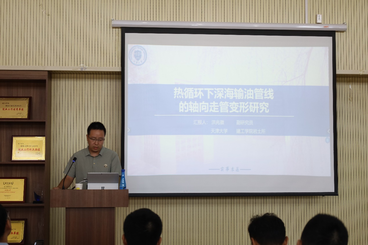 围绕“深地与深海工程中的岩土工程问题”主题,五位优秀青年教师开展了精彩的学术报告。姚伟研究员就“深部岩石动态断裂韧度精准测量”,重点介绍了具有创新性的岩石动态断裂强度及韧度的测试手段;洪兆徽副研究员就“热循环下深海输油管线的轴向走管变形研究”,讲解了深海高温高压输油管道发生轴向走管现象的内在机理;梁超老师就“变径井筒复合桩承载力及结构完整性研究”,阐述了变径效应对于井筒复合桩承载性能及桩体完整性的影响;魏新栋老师就“基于离散弹簧模型的岩石数值重构及破裂过程模拟研究”,详细剖析了离散弹簧模型在岩石单元试验及边值问题应用上的优势;芮福鑫老师就“强电磁辅助机械破岩的物理实验与耦合数值分析”,分享了强电磁辅助机械破岩手段的应用机理及现有工程推进情况。与会青年教师、硕博士研究生与报告人进行了充分交流。