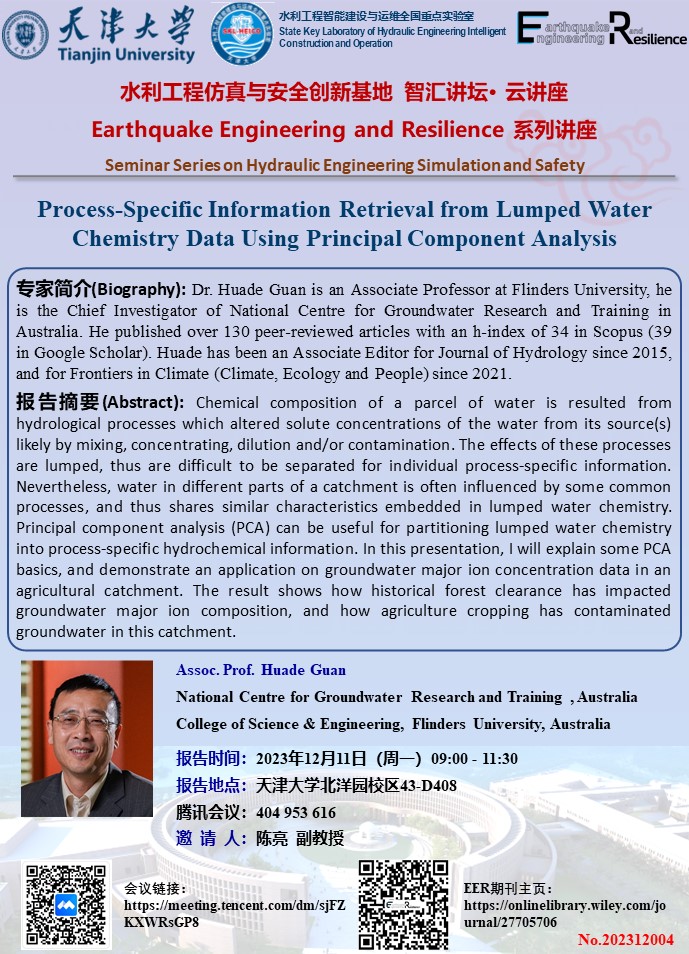 2023年12月11日上午9:00-11:30,澳大利亚弗林德斯大学Huade Guan教授将通过线下和线上带来题目为《Process-Specific Information Retrieval from Lumped Water Chemistry Data Using Principal Component Analysis》的前沿讲座,诚邀各位老师和同学参加。