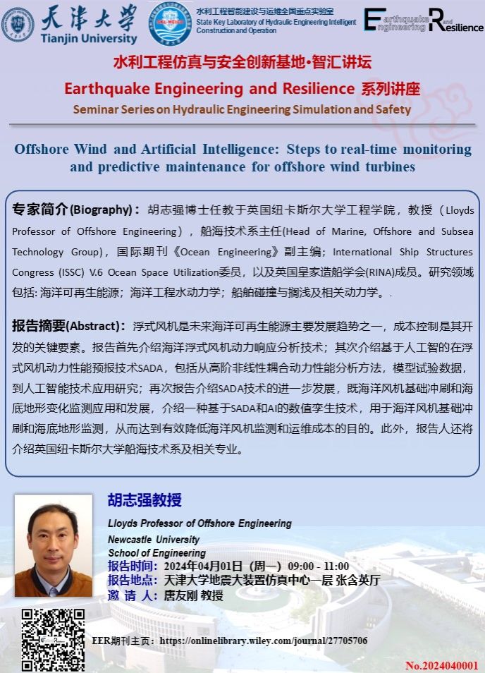 2024年4月1日9:00-11:00,英国纽卡斯尔大学胡志强教授将带来《Offshore Wind and Artificial Intelligence: Steps to real-time monitoring and predictive maintenance for offshore wind turbines》的前沿学术讲座,诚邀各位老师和同学参加。讲座地点:天津大学地震大装置仿真中心一层 张含英厅。