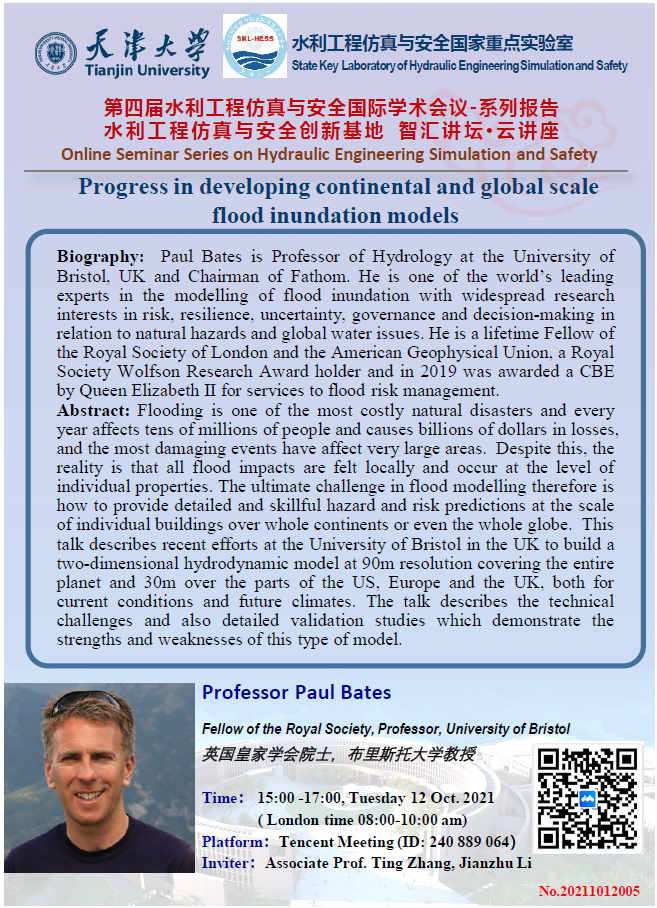 10月12日下午15:00-17:00,英国皇家学会院士、布里斯托大学Paul Bates教授将通过“云端”为大家带来主题为“Progress in developing continental and global scale flood inundation models”的报告,腾讯会议 ID 240 889 064,诚邀各位老师和同学参加。