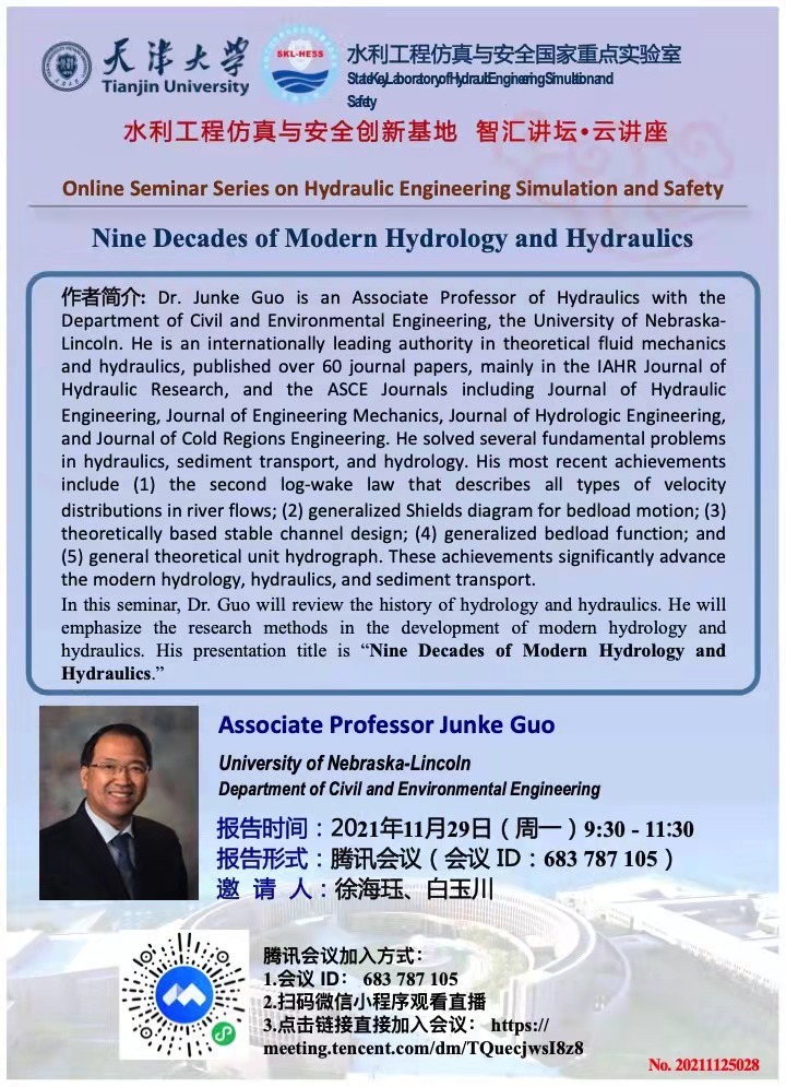 2021年11月29日上午9:30-11:30,University of Nebraska-Lincoln的Guo Junke博士将通过“云端”为大家带来主题为“Nine Decades of Modern Hydrology and Hydraulics”的报告,腾讯会议 ID 683787105。以下是海报信息,诚邀各位老师和同学参加。