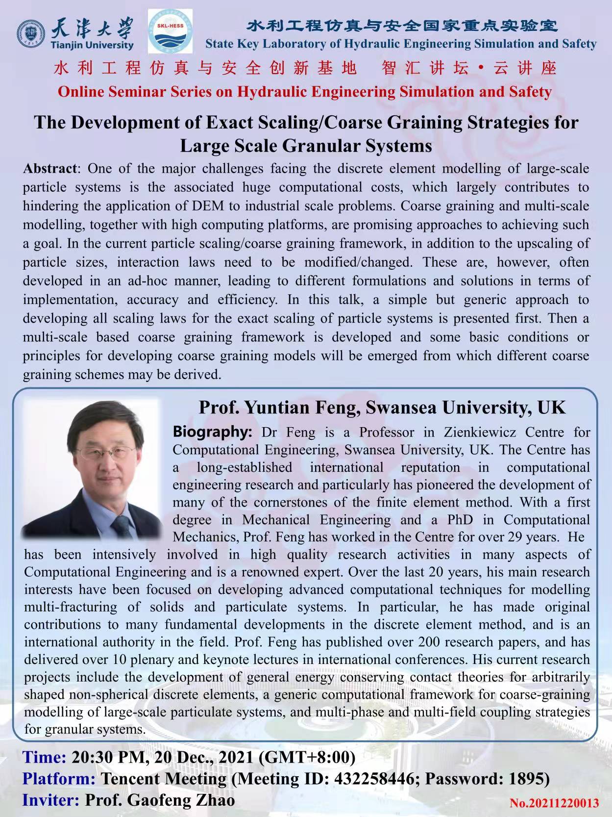 12月20日晚20:30-22:30,英国斯旺西大学Yuntian Feng教授将通过“云端”为大家带来主题为“The Development of Exact Scaling/Coarse Graining Strategies for Large Scale Granular Systems”的报告,腾讯会议 ID 432 258 446,密码 1895。以下是海报信息,诚邀各位老师和同学参加。