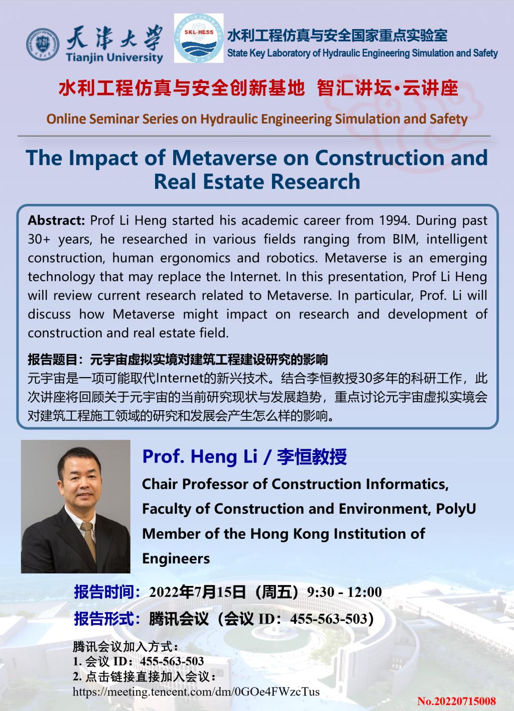 2022年7月15日上午9:30-12:00,香港理工大学Heng Li教授将通过“云端”为大家带来主题为“The Impact of Metaverse on Construction and Real Estate Research/元宇宙虚拟实境对建筑工程建设研究的影响”的学术报告,腾讯会议ID 455 563 503。以下是海报信息,诚邀各位老师和同学参加。