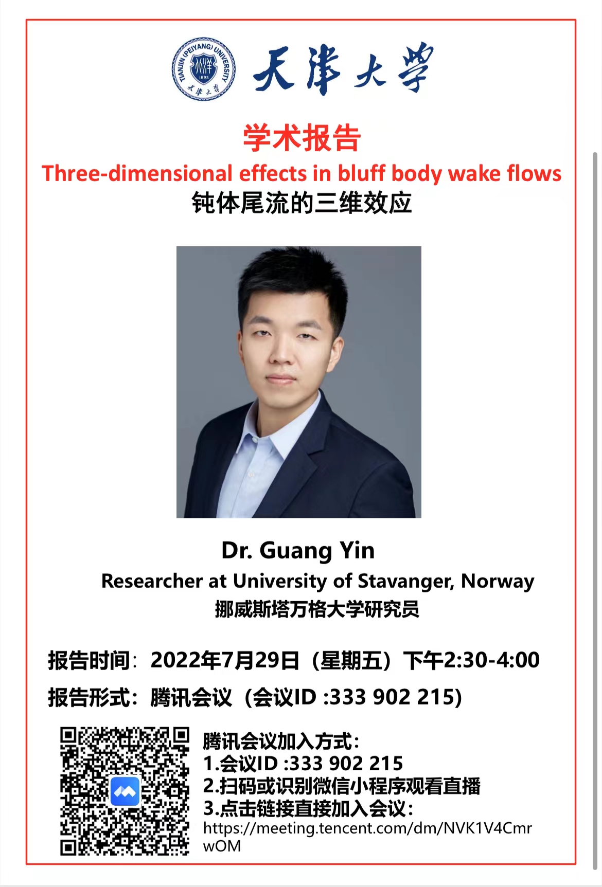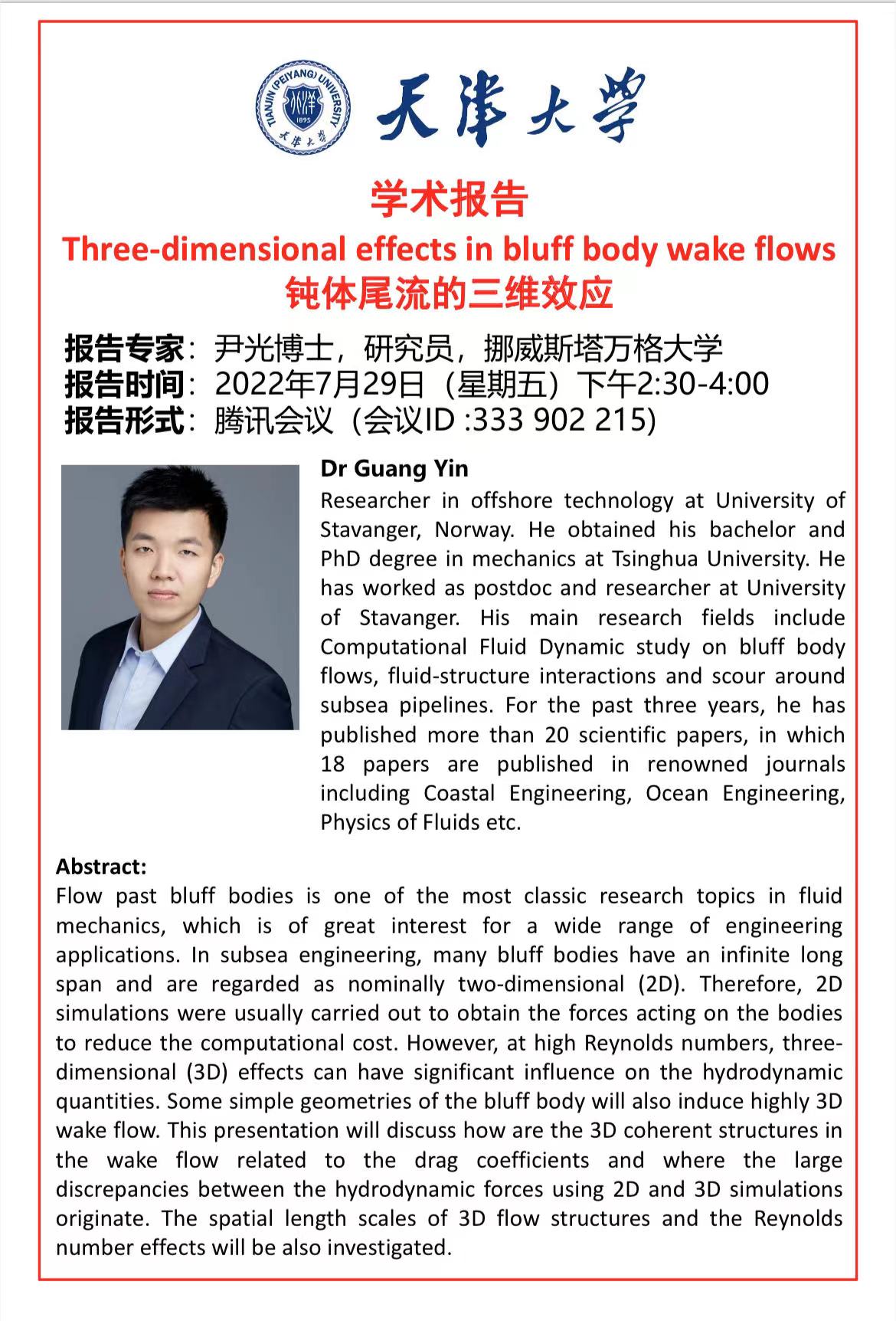 2022年7月29日下午2:30-4:00,挪威斯塔万格大学尹光老师将带来在线学术讲座,主题为钝体尾流的三维效应,腾讯会议号:330902215,会议链接如下https://meeting.tencent.com/dm/NVK1V4CmrwOM,诚邀各位老师和同学参加。