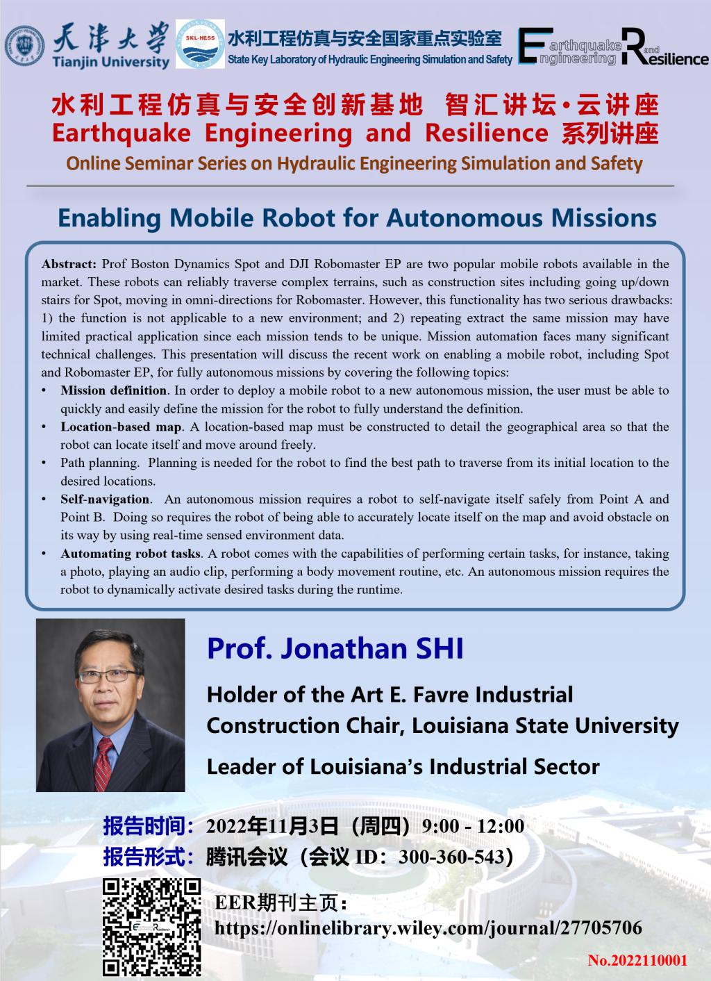 2022年11月3日上午09:00-12:00,应李明超教授邀请,美国路易斯安那州立大学Jonathan Shi教授将通过“云端”为大家带来关于“Enabling Mobile Robot for Autonomous Missions/用于完成自主任务的智能机器人”的学术报告,腾讯会议ID:300-360-543。以下是海报信息,诚邀各位老师和同学参加。