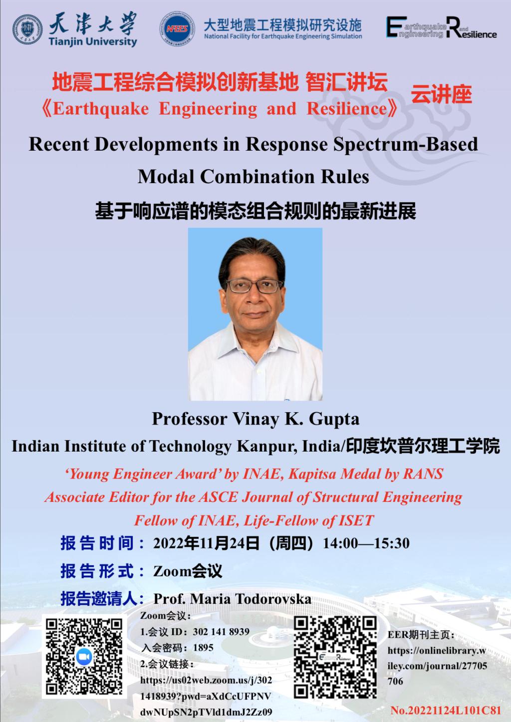 2022年11月24日14:00—15:30,印度坎普尔理工学院Vinay K. Gupta教授将通过“云端”为大家带来关于“Recent Developments in Response Spectrum-Based Modal Combination Rules/基于响应谱的模态组合规则的最新进展”方面的讲座和交流,Zoom会议号:302 141 8939,会议密码:1895。具体信息请您查阅海报,诚邀感兴趣的老师和同学参加。