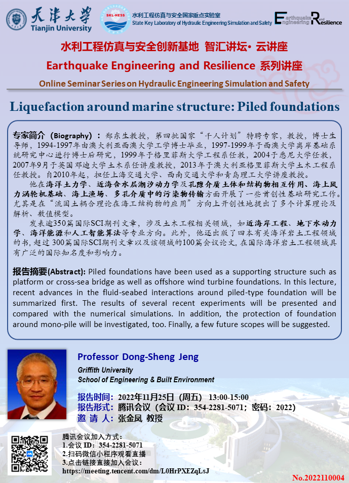 2022年11月25日13:00-15:00,应张金凤教授邀请,澳大利亚格里菲斯大学Dong-Sheng Jeng教授将通过“云端”为大家带来关于“Liquefaction around marine structure: Piled foundation/中文题目:海洋结构物周围的液化:桩柱”的第四次学术报告,腾讯会议ID:354-2281-5071, 密码:2022。以下是海报信息,诚邀各位老师和同学参加。