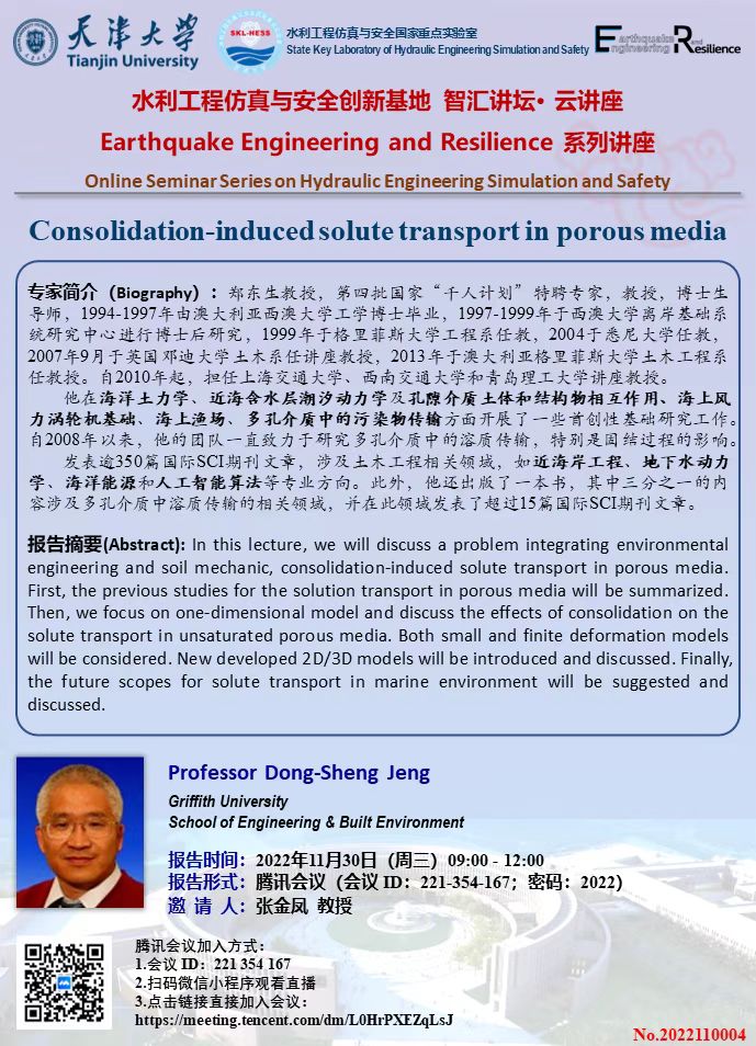 2022年11月30日上午09:00-11:00,应张金凤教授邀请,澳大利亚格里菲斯大学Dong-Sheng Jeng教授将通过“云端”为大家带来关于“Consolidation-induced solute transport in porous media/多孔介质中固结诱导的溶质运移”的学术报告(第五次),腾讯会议ID:221 354 167,密码:2022。诚邀各位老师和同学参加。