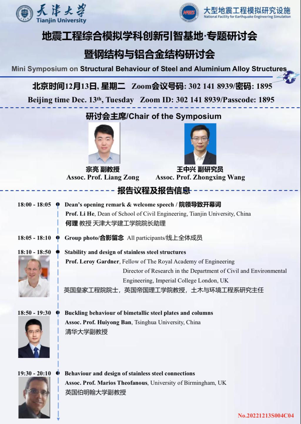 2022年12月13日18:00-22:00,邀请了来自英国帝国理工学院、英国伯明翰大学、英国利物浦约翰摩尔大学、英国谢菲尔德大学和清华大学等知名高校五位钢结构与铝合金结构领域专家,就相关热点问题展开前沿报告和研讨,研讨晚上18:00开始,Zoom ID: 302 141 8939/Passcode: 1895;具体信息请您查阅海报,诚邀各位感兴趣的老师和同学参加。