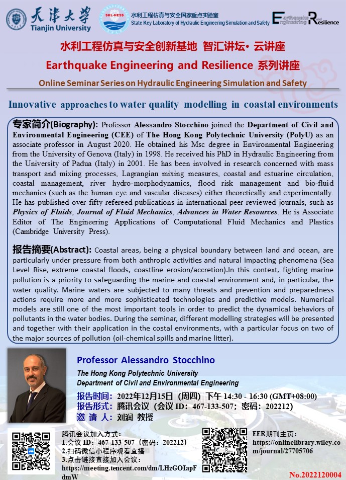 2022年12月15日14:30-16:30,应刘润教授、陈亮副教授邀请,香港理工大学Alessandro Stocchino教授将通过“云端”为大家带来关于“Innovative approaches to water quality modelling in coastal environments/海岸带水质模拟新方法”的学术报告,腾讯会议ID:467-133-507(密码:202212)。以下是海报信息,诚邀各位老师和同学参加。