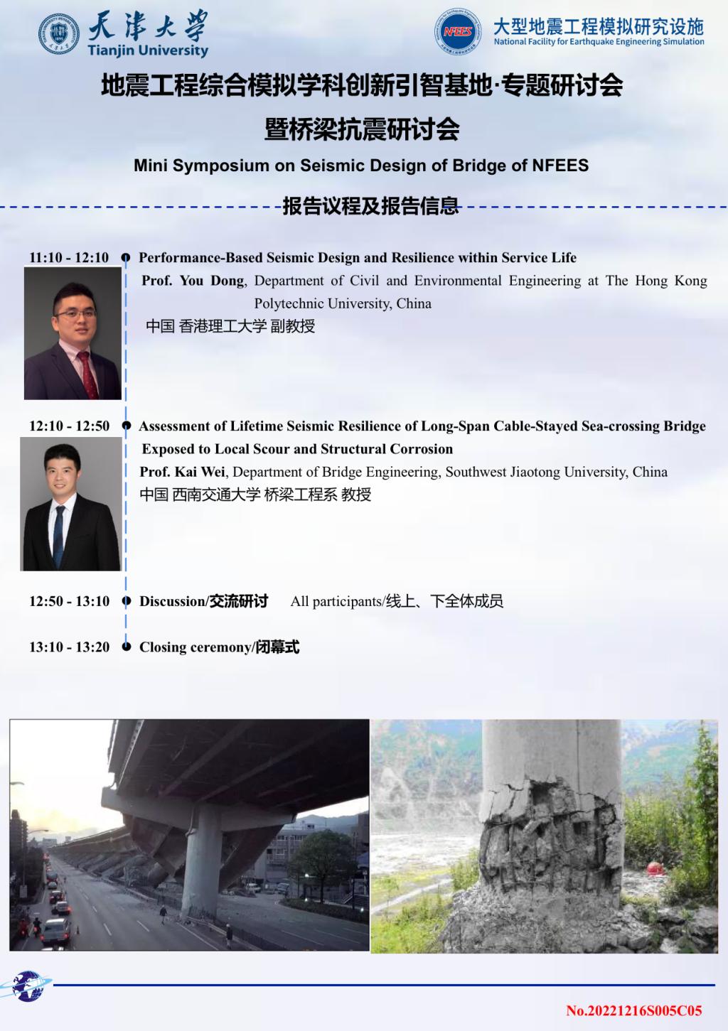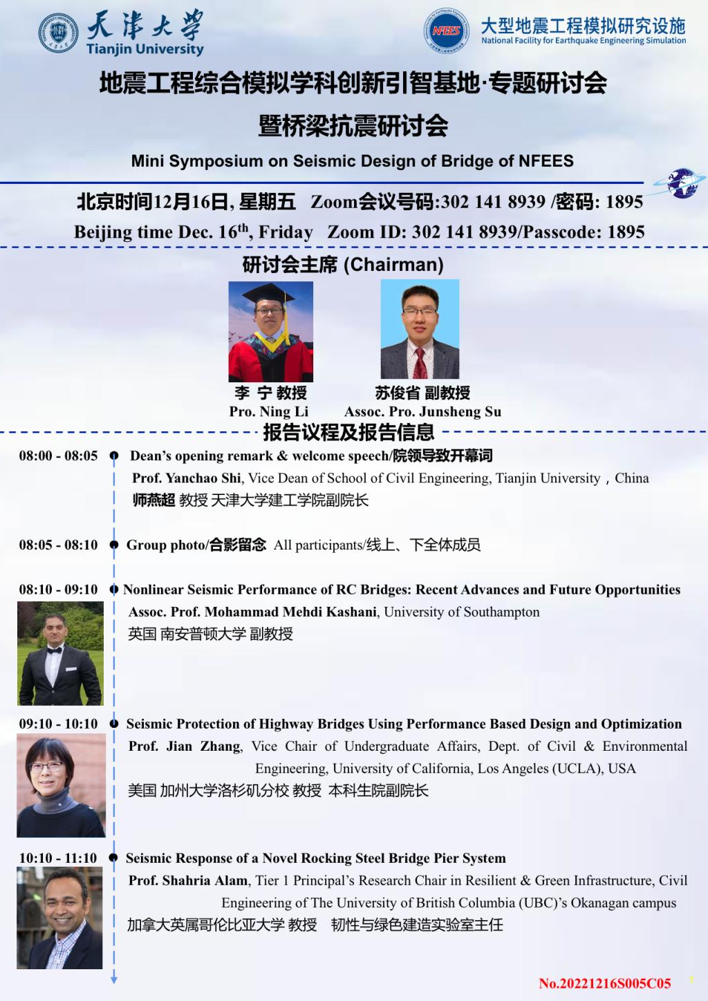 2022年12月16日明天 8:00-13:00,来自英国南安普顿大学 、美国加州大学洛杉矶分校 、加拿大英属哥伦比亚大学、香港理工大学和西南交通大学等知名高校五位桥梁抗震领域专家,将就相关热点问题展开前沿报告和研讨,研讨明天早上8:00准时开始,Zoom ID: 302 141 8939/Passcode: 1895;具体信息请您查阅海报,诚邀各位感兴趣的老师和同学参加。