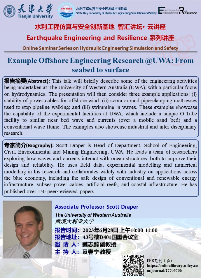 2023年6月28日上午10:00-11:00在43楼D401会议室,应港口系臧志鹏副教授邀请,The University of Western Australia/西澳大利亚大学Scott Draper 教授将带来主题为Example Offshore Engineering Research @UWA: From seabed to surface的报告。以下是海报信息,诚邀各位老师和同学参加。