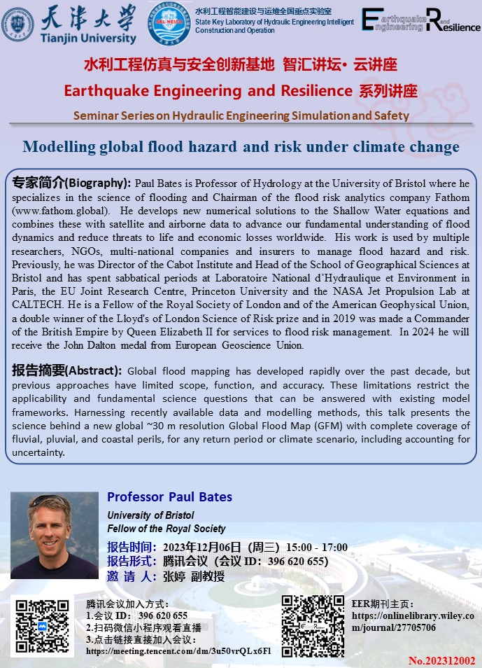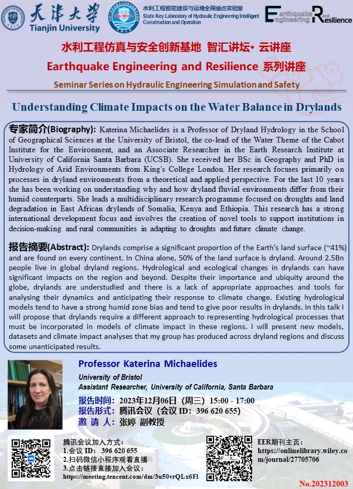 2023年12月6日下午15:00-17:00,英国布里斯托大学Paul Bates和Katerina Michaelides教授将分别带来题目为“Modelling global flood hazard and risk under climate change”和“Understanding Climate Impacts on the Water Balance in Drylands”的前沿讲座,诚邀各位老师和同学参加。腾讯会议ID:396-620-655。