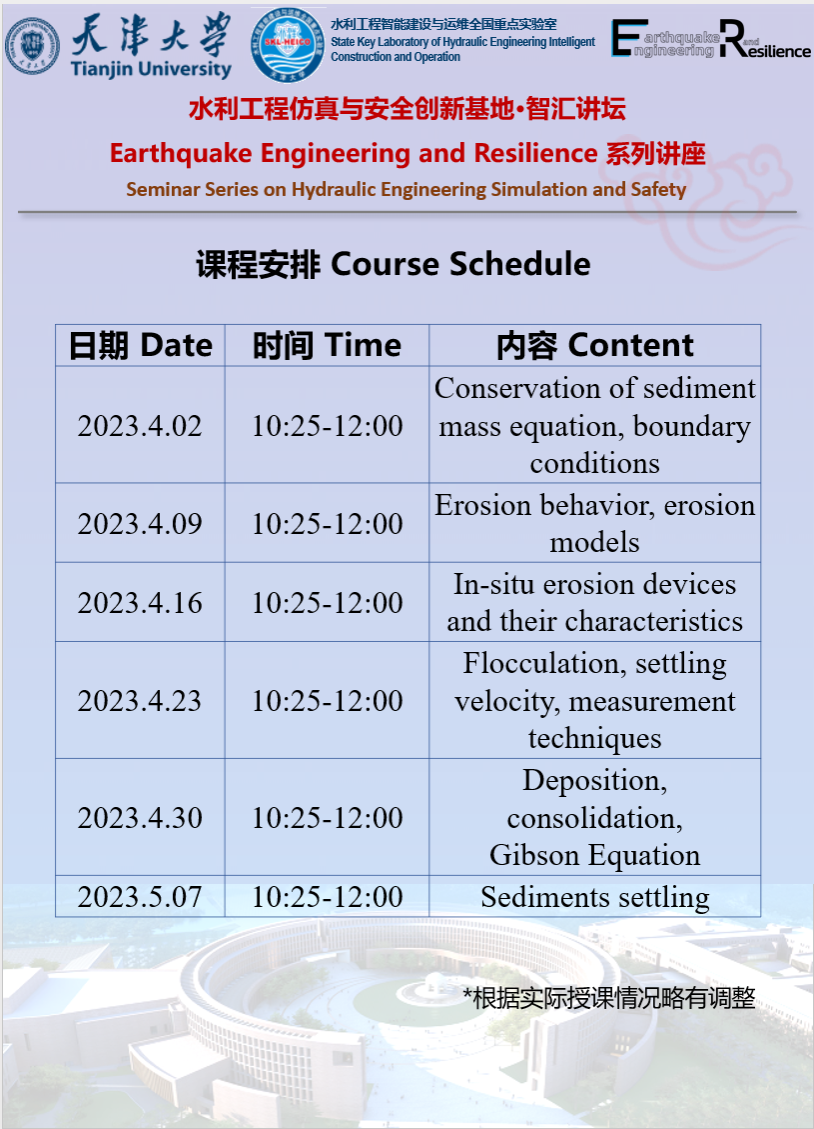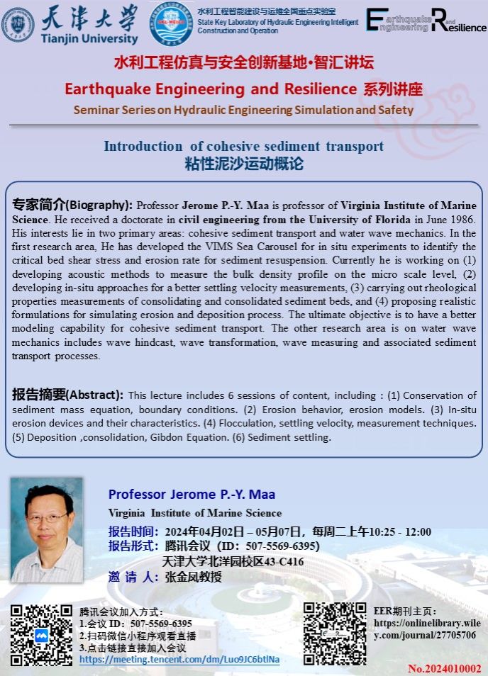 2024年4月2日至5月7日每周二10:25-12:00,美国弗吉尼亚海洋科学研究所Jerome P.-Y. Maa教授将通过“云端”为大家带来关于“粘性泥沙运动概论”的研究生课程。课程形式:线上腾讯会议(ID:507-5569-6395)或者天津大学北洋园校区43-C416。以下是海报信息,诚邀各位老师和同学参加。