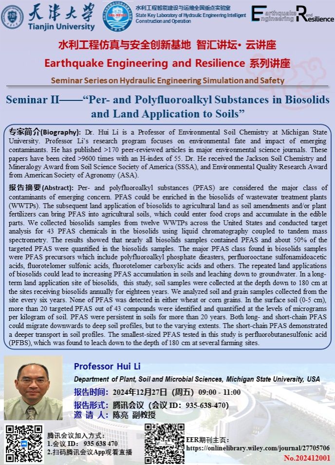 2024年12月27日上午9:00-11:00,美国Michigan State University的Hui Li教授将通过云端带来主题为“Per- and Polyfluoroalkyl Substances in Biosolids and Land Application to Soils”的学术前沿讲座,诚邀各位老师和同学参加。会议ID: #腾讯会议:935-638-470。