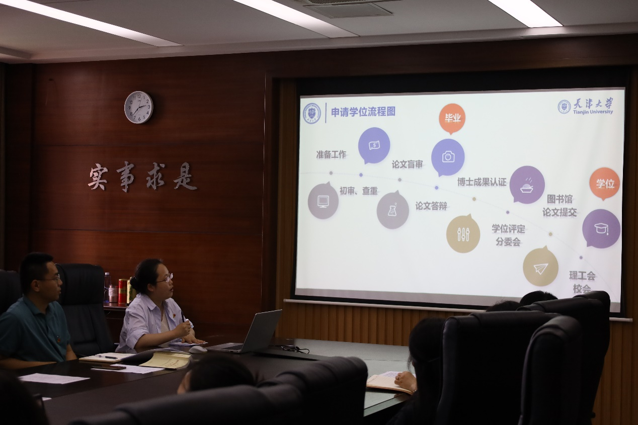 根据前期调研需求,行政党支部喻敏琦同志就博士班级同学十分关心的博士毕业与学位管理方面的问题,结合自己的工作经验,对博士学位申请流程方面的内容进行了梳理和讲解,并针对关键的时间节点进行了重点介绍,解答了同学们关于博士学位申请的诸多疑惑。