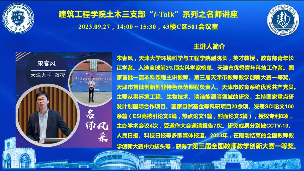 为了提升进一步提升教学质量,切实做好‘经师’和‘人师’的统一,土木三支部“i-Talk”系列之“教学明星经验交流会”于2023年9月27日成功举办。此次讲座邀请到来自天津大学环境科学与工程学院副院长,英才教授、教育部青年长江学者宋春风教授,进行题为“新工科背景下专业课程的教学创新与实践”的精彩报告。此次活动土木三支部联合土木一支部、二支部和建2021级硕士生硕士二班党支部联合开展。