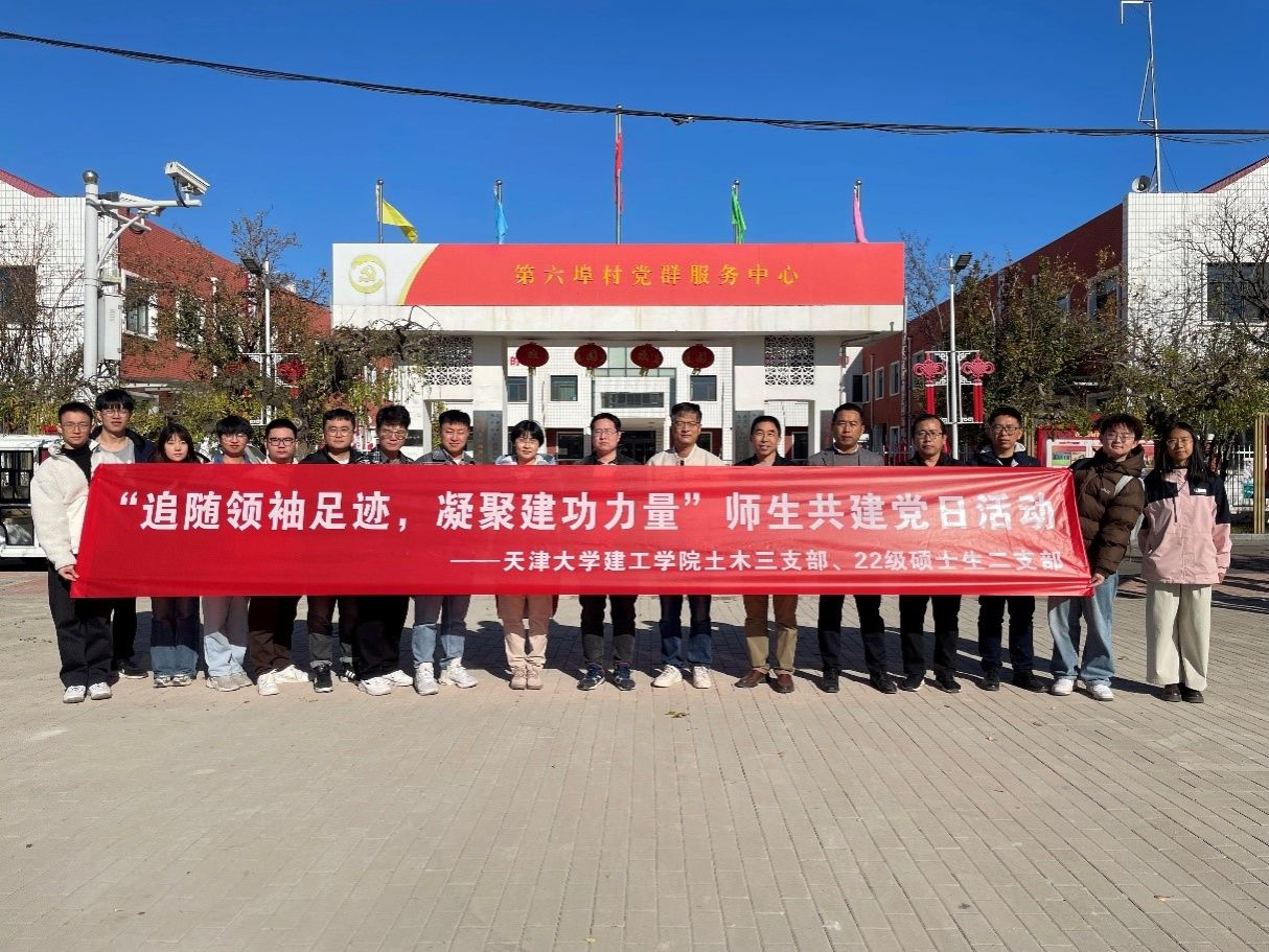 (通讯员:徐杰、刘重阳)为加强党员理想信念教育、规范基层党组织生活、促进师生之间交流合作,天津大学建工学院土木三支部联合2022级硕士生2班党支部,在2024年11月21日,走进天津市第六埠村,开展主题为“追随领袖足迹,凝聚建功力量”的主题党日活动。通过在第六埠村的实地参观和交流学习,师生党员深入学习了习近平总书记视察天津的重要讲话精神,深刻体会了第六埠村基层党员及群众团结一心众志成城的抗洪力量,真切思考了自身肩负的历史使命与时代复兴的伟大梦想。