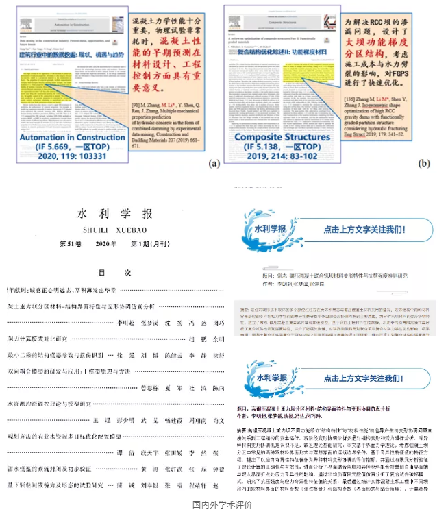 研究生学习期间,在导师的悉心指导下,共发表论文22篇,其中以第一、通讯作者或第二作者(导师一作)的身份发表高水平学术论文13篇,其中SCI论文7篇(均为TOP期刊),已授权或公开国家发明专利8项,相关成果主要发表在《Engineering Structures》《Construction and Building Materials》《Advanced Engineering Informatics》等期刊上,文章多次被国际专家整段引用,如:国际复合结构领域专家Saeed Kamarian在《Composite Structures》发表的综述论文将本人提出的高碾压混凝土重力坝功能梯度分区结构作为代表性进展进行整段介绍,充分肯定了该成果的价值;发表在《Automation in Construction》的综述文章《建筑行业中的数据挖掘》大篇幅引用了本人水工混凝土多力学性能智能挖掘的成果,认为“混凝土性能的早期预测在材料设计、工程质量、进度和成本控制方面具有重要意义”,对本人研究成果作出充分肯定。中文论文主要发表在水利行业创刊最早且最具影响力的顶级期刊《水利学报》上,其中2篇文章被编辑部推荐为重点导读文章,1篇文章作为2020年第一期第一篇学术论文在《水利学报》上发表,凭借丰硕的学术成果先后两次获研究生国家奖学金,获得国家留学基金委资助出国的2020联合培养博士资格,获2020年获天津大学优博基金以及2021博士学位论文国际评审项目资助,同时从进入研究生阶段以来,连续五年均获得一等学业奖学金。