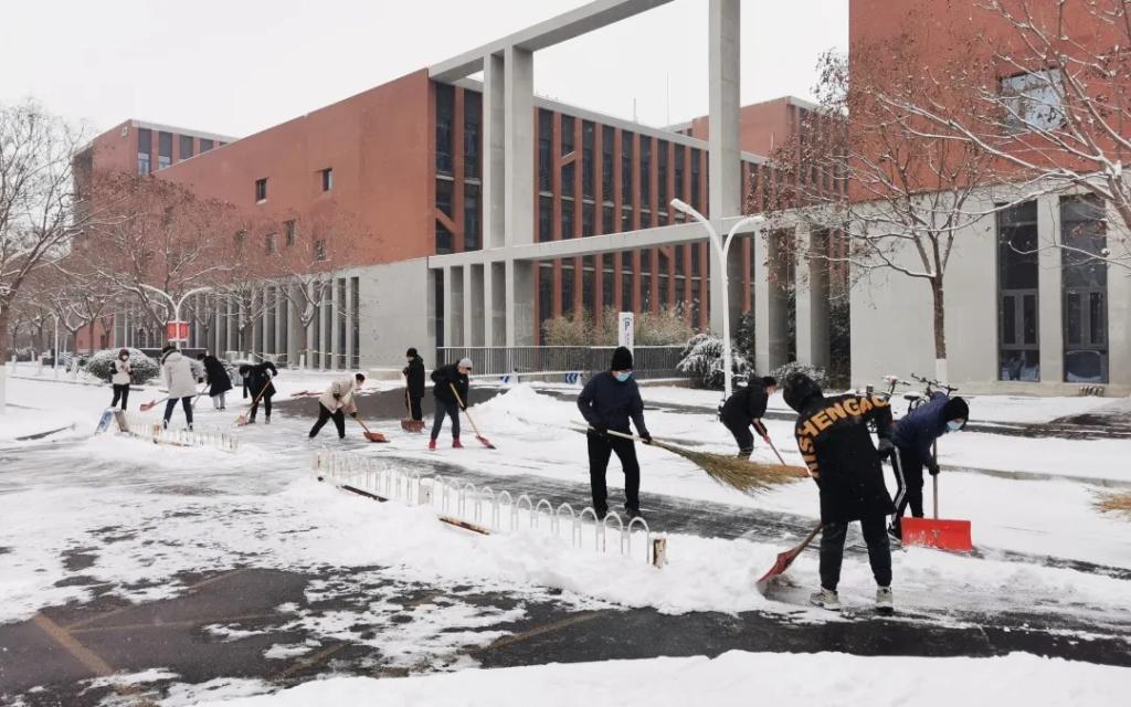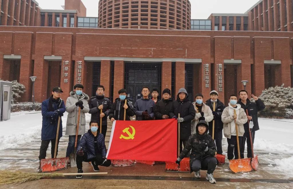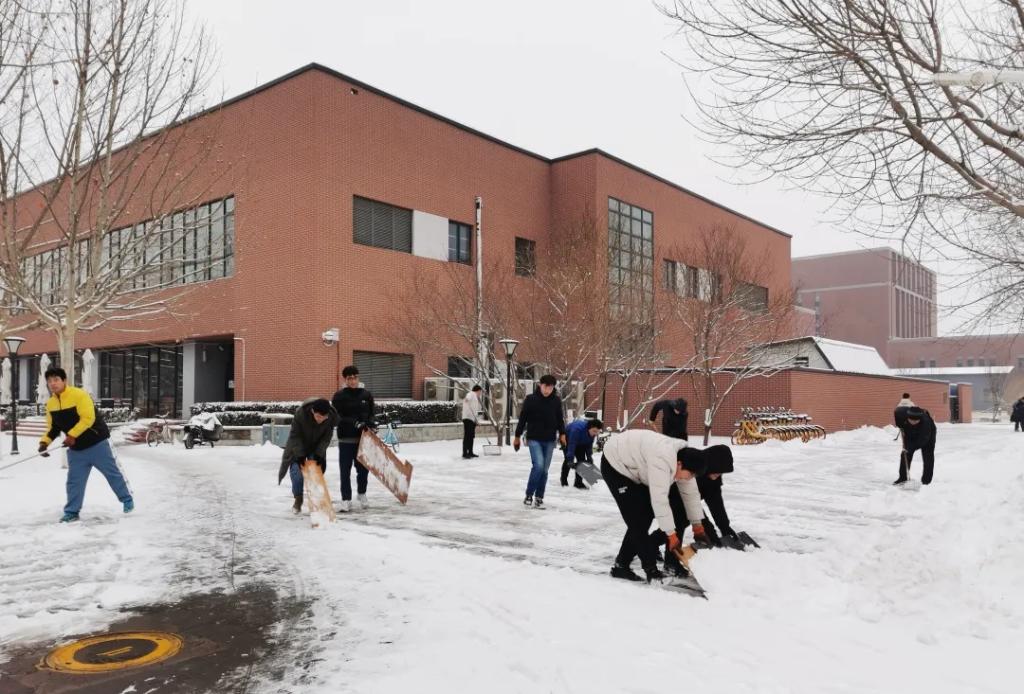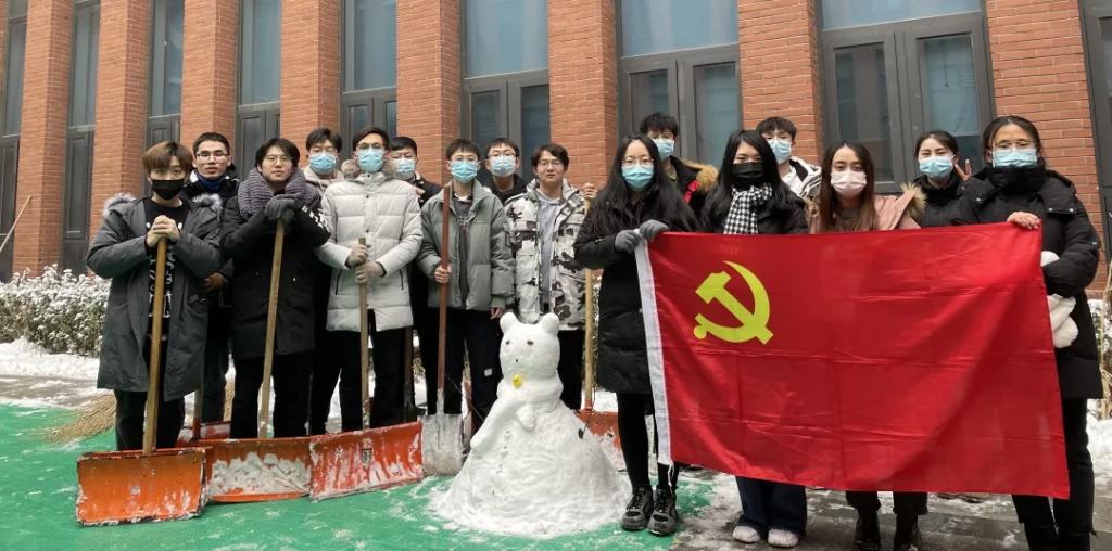 21级硕士十一班党支部,集体申请加入扫雪工作,经过一中午的努力,将水利馆周边人行道的积雪清理完毕后,又转战43楼天井,清扫露天羽毛球场,参加除雪的党员们团结一致、凝心聚力,以实际行动践行为人民服务的宗旨。